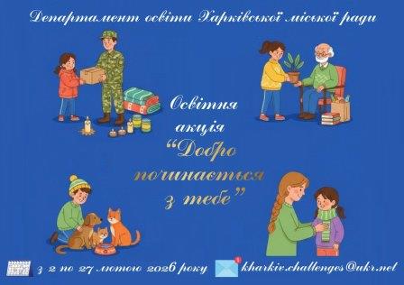 Департамент освіти Харківської міської ради запрошує родини дошкільнят, учнів 1–11-х класів, представників позашкілля, педагогічні та батьківські колективи долучитися до традиційної освітньої акції «Добро починається з тебе», що триватиме з 2 по 27 лютого 2026 року.