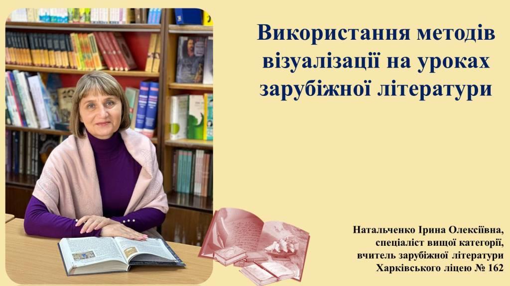 Спікеркою Школи виступила Ірина Олексіївна Натальченко, спеціаліст вищої категорії, учителька зарубіжної літератури Харківського ліцею № 162, яка поділилася власним практичним досвідом застосування візуальних методик у навчальному процесі.